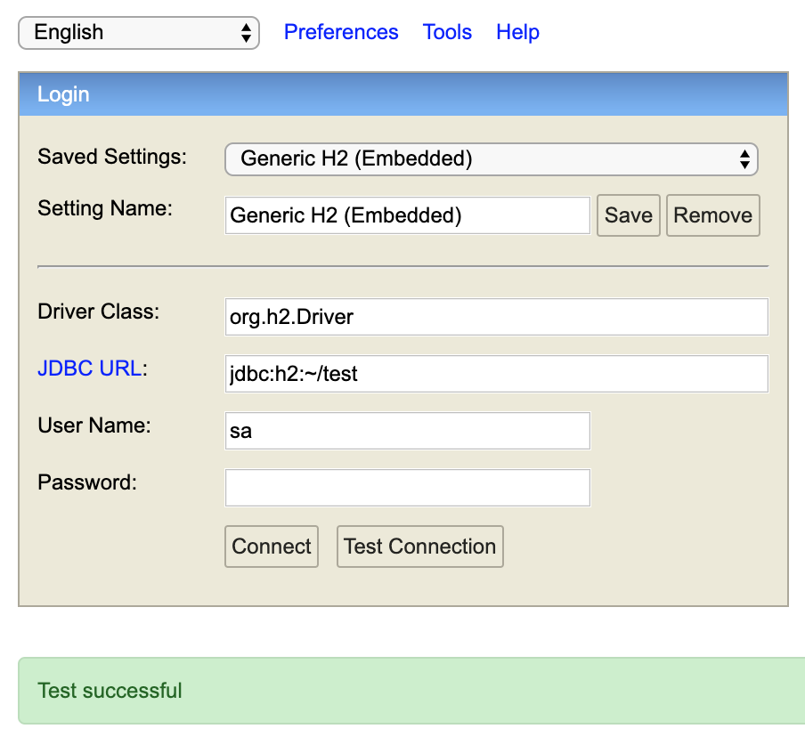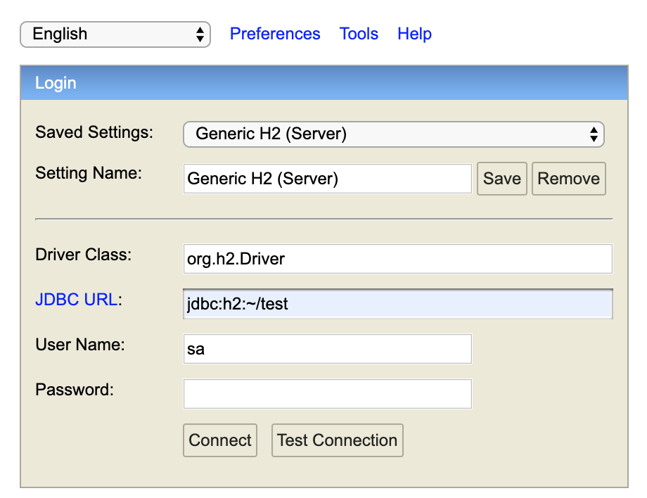JDBC URL : jdbc:h2:~/test