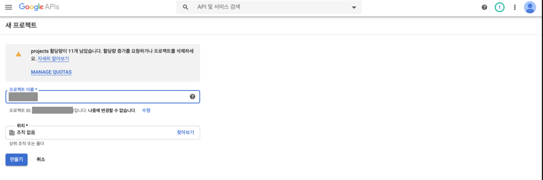프로젝트 이름을 넣고 생성