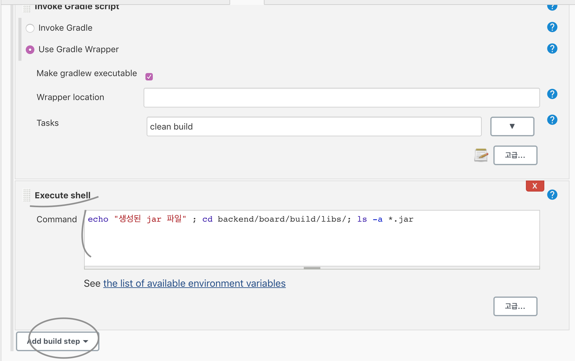 Bulid 단계에 다음과 같이 추가 - Execute shell